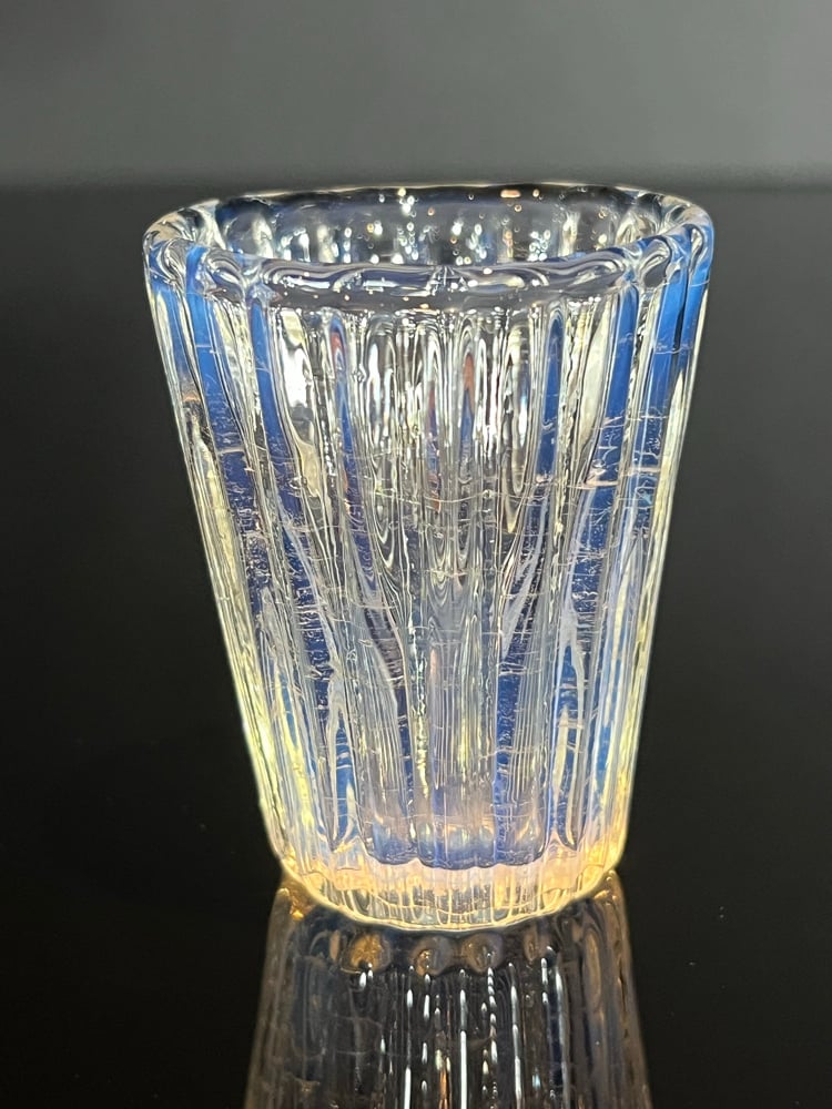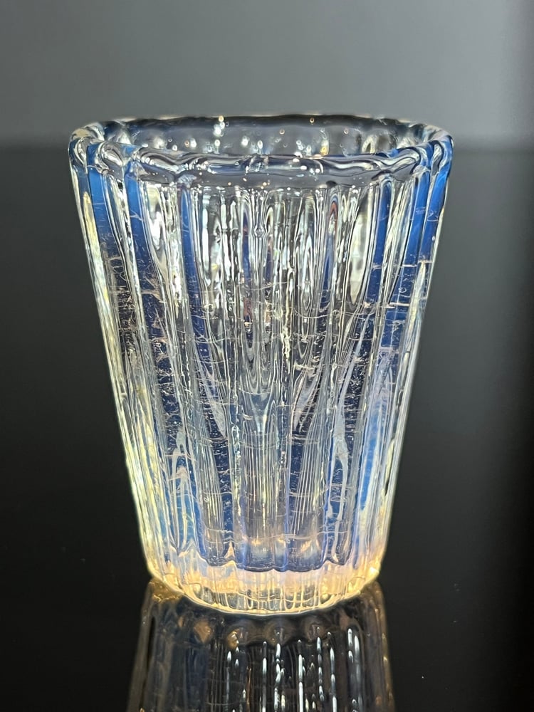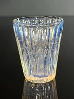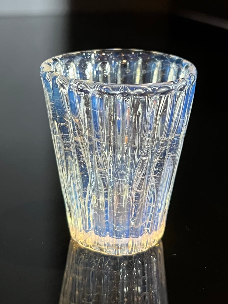 Shot glass with optical molded ridges and a light opaline color that makes the glass change color depending on the color of what is inside it or behind it.